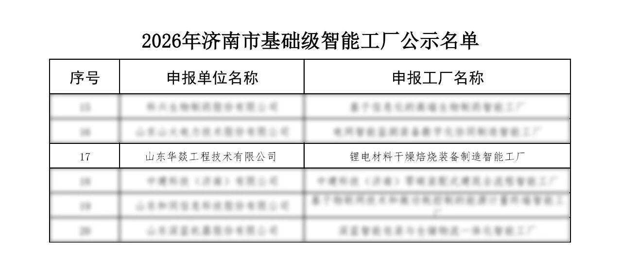 近日,济南市工业和信息化局发布《关于2026年度济南市基础级智能工厂名单的公示》,山东华燚工程技术有限公司凭借「锂电材料干燥焙烧装备制造智能工厂」项目,成功入选2026年度济南市基础级智能工厂名单!