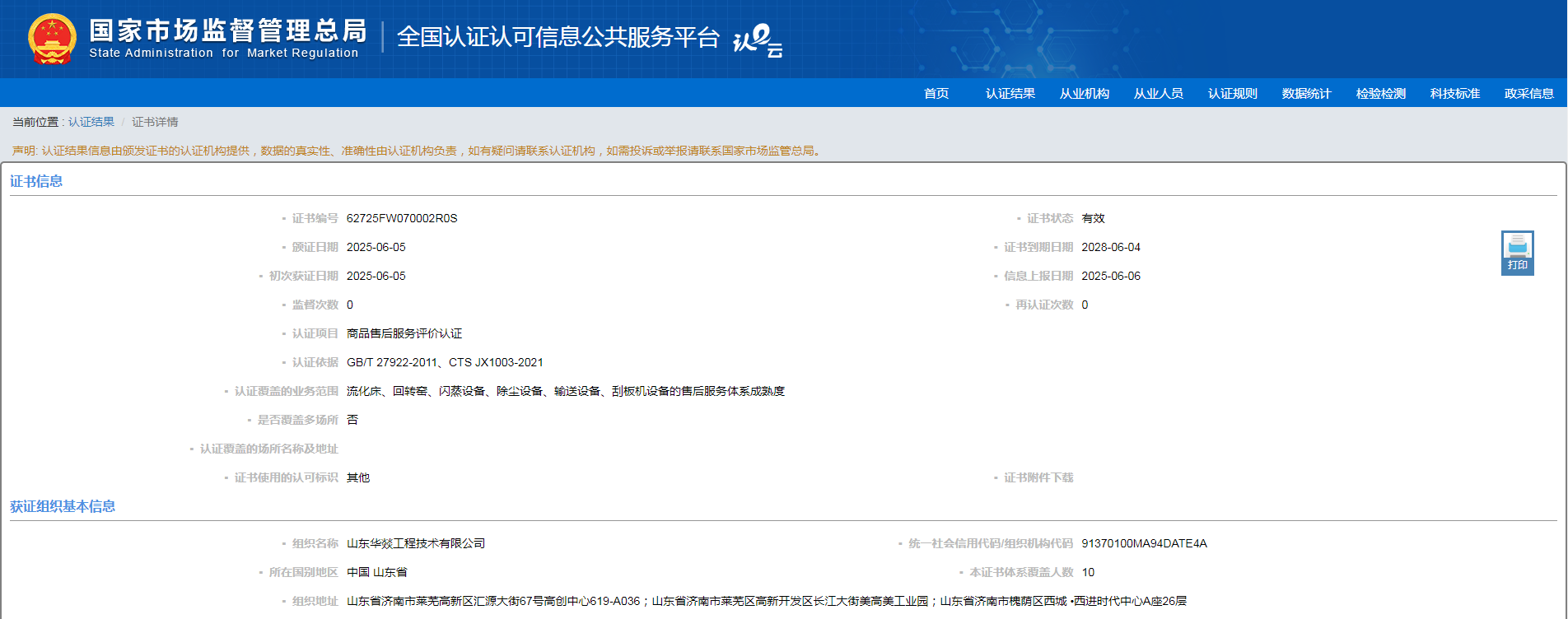 该证书覆盖范围:流化床、回转窑、闪蒸设备、除尘设备、输送设备、刮板机设备的售后服务体系成熟度。华燚工程荣获这一认证不仅是对华燚工程服务能力的权威认可,更标志着其在从“工业制造”向“工业服务”转型跨越,为干燥焙烧装备的高质量服务树立新标杆。