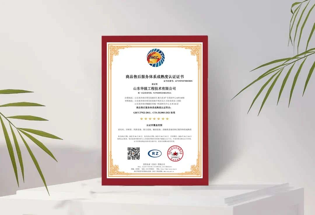 日前,山东华燚工程技术有限公司(以下简称“华燚工程”)凭借完善的售后服务体系、优秀的服务质量,顺利通过国家标准GB/T 27922-2011《商品售后服务评价体系》及CTS JX1003-2021成熟度认证评价,荣获七星级售后服务成熟度认证证书。