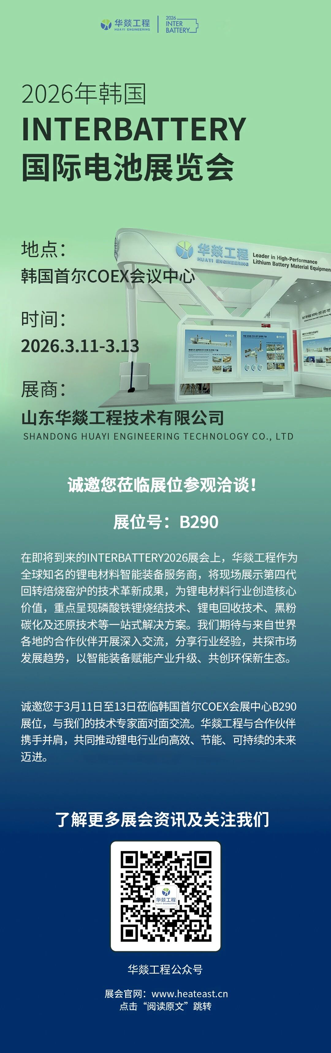 春启首尔,共襄盛会!备受全球新能源行业瞩目的InterBattery 2026(韩国首尔国际电池储能展览会)将于2026年3月11日至13日,在韩国首尔COEX会议中心盛大启幕。作为新能源锂电材料高端装备引领者,山东华燚工程技术有限公司携核心产品与创新技术重磅参展,诚邀全球行业同仁、合作伙伴莅临展位,共探电池技术革新方向,共拓全球新能源合作新机遇!