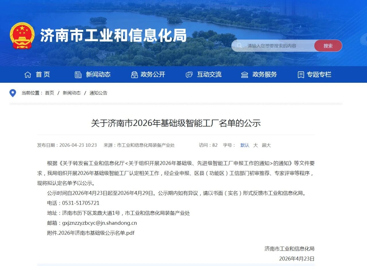近日,济南市工业和信息化局发布《关于2026年度济南市基础级智能工厂名单的公示》,山东华燚工程技术有限公司凭借「锂电材料干燥焙烧装备制造智能工厂」项目,成功入选2026年度济南市基础级智能工厂名单!